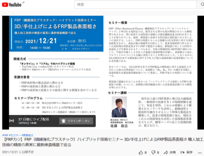 FRP(繊維強化プラスチック)ハイブリッド技術セミナー 3D/手仕上げによるFRP製品表面粗さ ~職職人加工技術の精度の真実に最新検査機器で迫る~ 2021年12月21日(火)14時~15時に当社初の試みとなる「ハイブリッドセミナー」を開催します。 リアルでは当... -